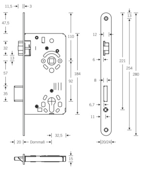 Haustür-Schloss Kl.3 PZW 65/92/10, Stulp 20 rund, silberfarbig lack. rechts